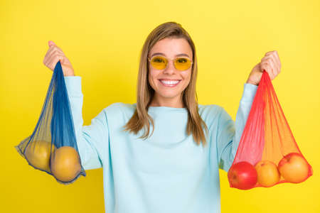 Portrait of attractive cheerful girl holding bags with apples organic menu diet isolated over vibrant yellow color background
