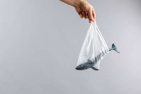 The concept of World Environment Day. The mans hand holds the blue whale in a plastic bag. In the blank for social advertising there is a place for the inscription.