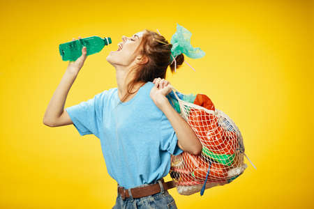 Woman holding a package with the inscription GO GREEN amid a pile of plastic bags. Zero waste concept. The concept of World Environment Day