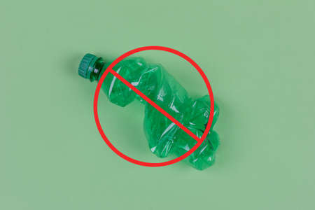 a green plastic bottle on a pale green background with a red forbidden sign on top. the concept of the problem to ban the use of plastic bags and containers and environment pollution