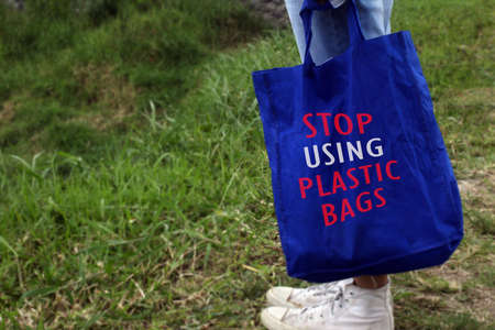 Young woman standing on grass holding a blue women foldable shopping bag reusable eco with text message - Just say no to plastic bags. Love nature and earth concept.