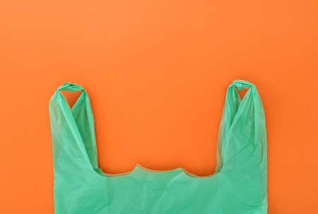 green plastic bag on orange background copy space, top view, zero waste concept,say no to plastic, nature pollution