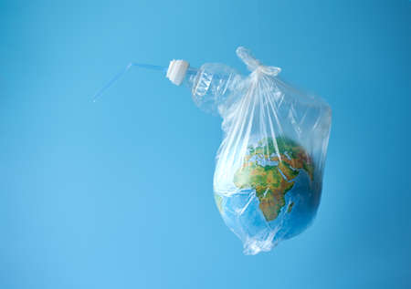 A globe in a plastic bag over a plastic bottle on a blue background. Concept: plastic garbage turns the planet into a waste dump. Copy space. Selective focus.