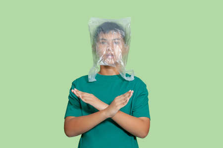 The boy made symbols for banning disposable plastic bags on green background, the concept of non-use of plastic bags.