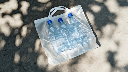 Recyclable plastic containers placed in a translucent bag set on a concrete floor