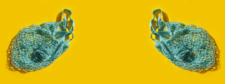 Plastic bag with mesh textile bag surrounded by plastic bottles and cups on pink background. Flat lay, top view. Plastic free items.