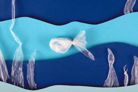 Blue sea waves background made from paper art with plastic fish. World ocean pollution concept.