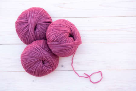 White clews of wool on a pink background. Place for your text. Top view