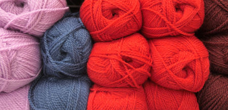 Multicolored abstract background of knitting balls of red, blue, white, green, brown, burgundy