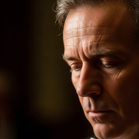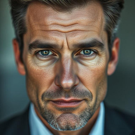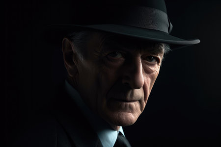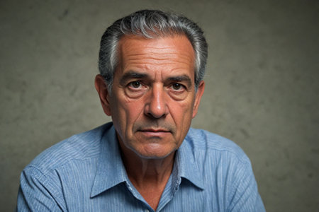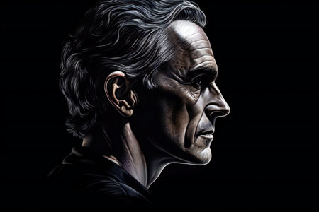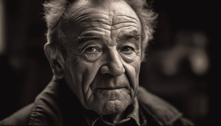 Close-up portrait of a mature man with an intense expression, captured in dramatic lighting. The image highlights facial details and conveys a sense of depth and character.
