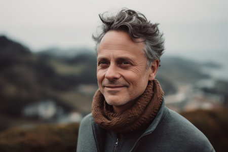Portrait of a handsome middle-aged man with gray hair, wearing a gray sweater and brown scarf, looking at the camera.