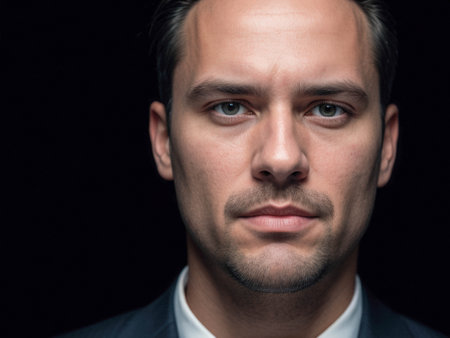 close-up portrait of an adult man in a black shirt, on a black background, studio, luxury life, advertising