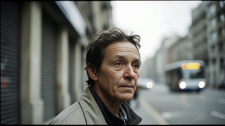 Old man with gray hair looking sad in outdoor portrait generated by artificial intelligence