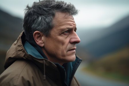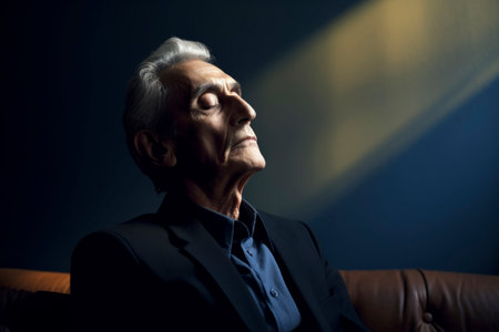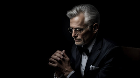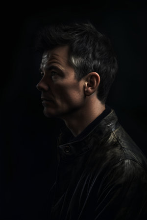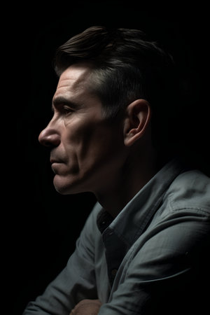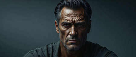 AI Generated. Mature man with intense expression in a dark setting feeling introspective and contemplative