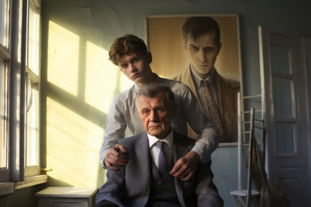 Teenage grandson hugging his grandfather in front of his father picture. Three generations of family men. Remembering family members. Time passing. Generative AI.