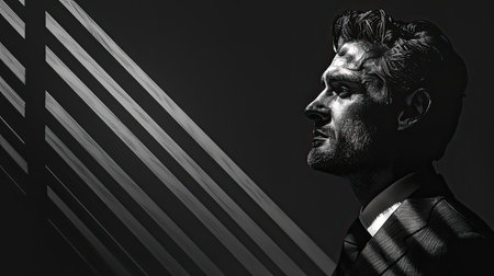 a black and white illustration of a man with curly hair, showcasing a futuristic victorian style. the design is dark and brooding, reminiscent of marvel comics. the bold outlines and flat colors give it a unique appeal, resembling celebrity portraits. the artwork also incorporates elements of chiaroscuro woodcuts, resulting in a handsome and captivating image. ai generated