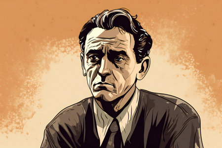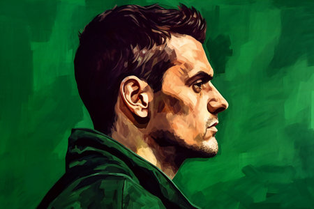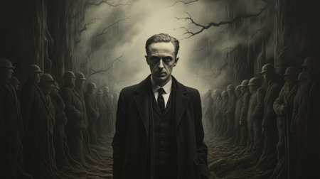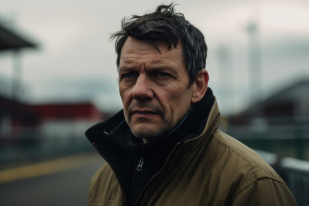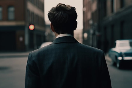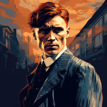 a man in dark clothing stands in front of an urban setting, captured in a simplified and stylized portrait. the painterly style of the image evokes a british topographical feel, reminiscent of a movie poster. the detailed portraiture showcases the hyper-detailed features of the character. ai generated