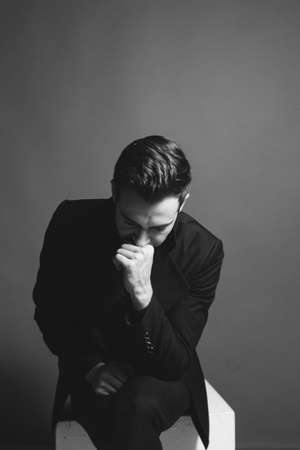 Studio portrait of a young caucasian man in a black blazer, looking down, standing against plain studio background