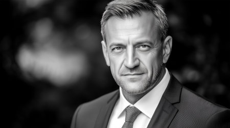 A striking black and white portrait captures a middle-aged man with a distinguished appearance, wearing a uniquely patterned suit and tie, set against a softly blurred outdoor background.