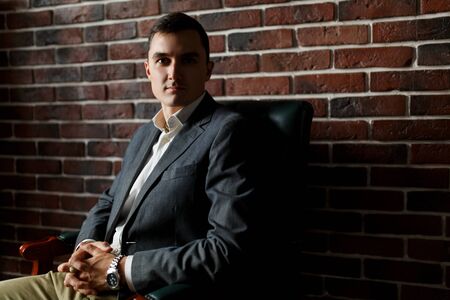 Portrait of a young handsome man in a suit with a sculpture in the background