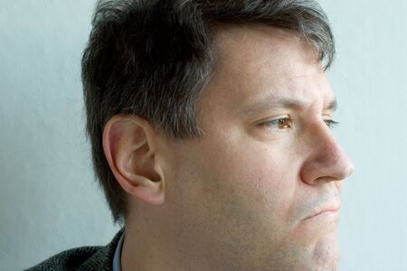 bust front portrait of middle aged man in blue t shirt isolated against grey background and looking