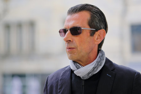 A close-up shot of a portrait of a middle-aged Caucasian man in dark glasses on the street looking away