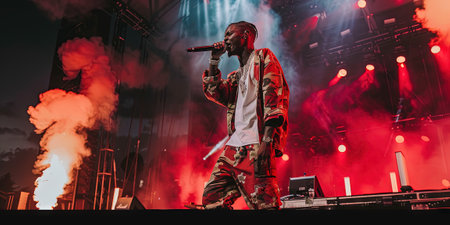 Energetic young black male artist performing passionately on stage amidst vibrant lights and smoke AI