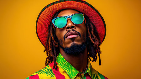 A reggae superstar stands in front of a bright solid background, dressed in classic Costa Rican colors. With a strong fashion sense, he embodies a lively spirit with his vibrant look.