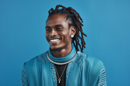 Studio portrait of a fashionable young man with dreadlocks smiling against a vibrant blue backdrop