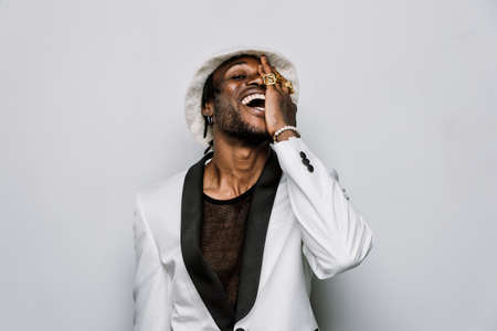 portrait of an hip hop music musician. Cinematic image of a man wearing party clothes and jewels