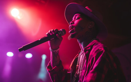 An electrifying moment showcasing a talented hiphop artist performing live, illuminated by vibrant lights and energy. Generative AI