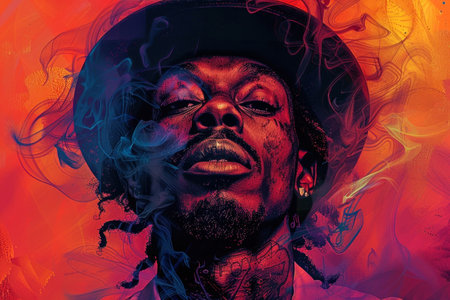 A young African-American man is wearing a hat and looking at the camera with a serious expression on his face. The man is surrounded by smoke.