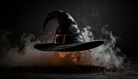 Surreal conceptual halloween scene of black witch hat floating in dense dark fog, eerie glowing orange backlight