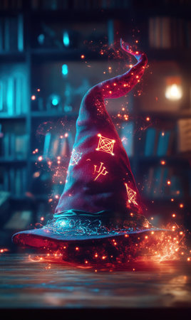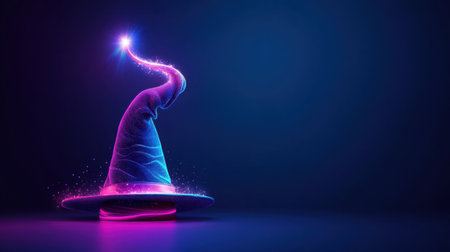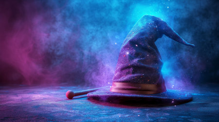 This captivating image features an enchanting magic hat with a glowing tip, swirling in vibrant blue and pink tones against a dark backdrop, perfect for fantasy themes.