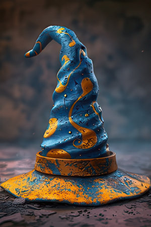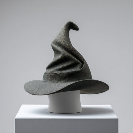 This image showcases a unique wizard hat design presented on a minimalist stand, perfect for fashion or costume themes. The gray texture adds depth.