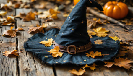 A charming witch's hat rests amidst vibrant autumn leaves and small pumpkins, creating an enchanting atmosphere perfect for fall festivities and Halloween celebrations.