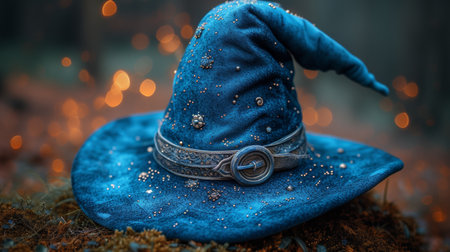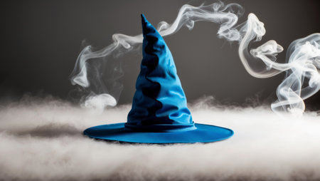 AI Generated. Blue wizard hat on a dark background surrounded by swirling smoke