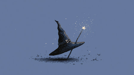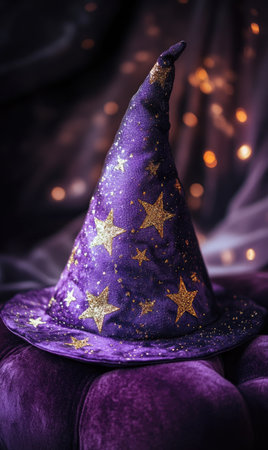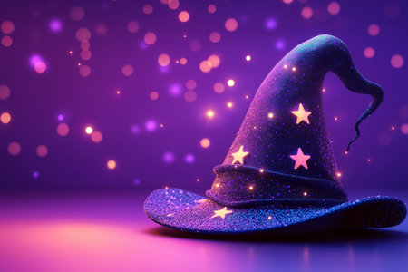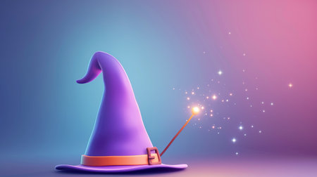A whimsical purple witch hat with a glowing magic wand emits sparkles against a colorful gradient background.