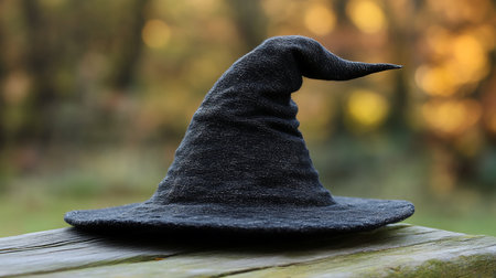 Witch's worn hat and broom lie on a rustic wooden table with dried leaves and branches, creating a spooky halloween atmosphere