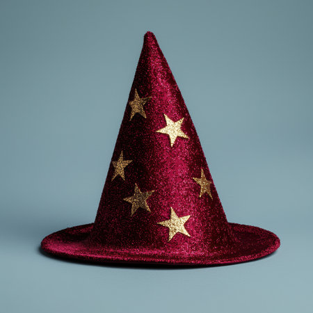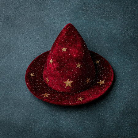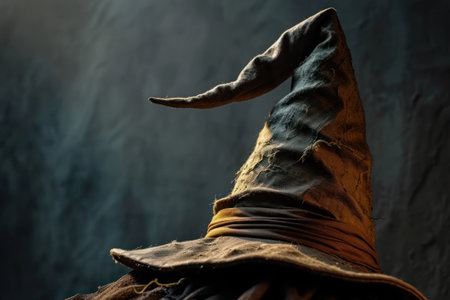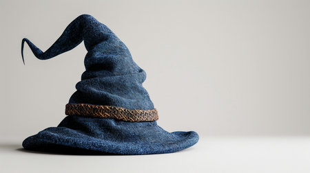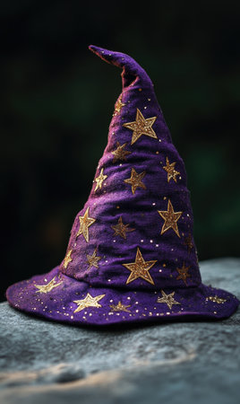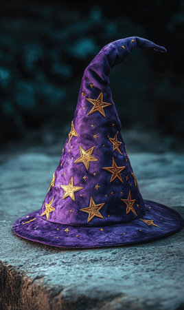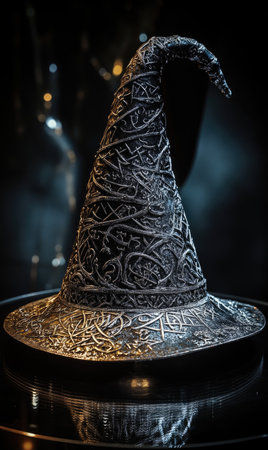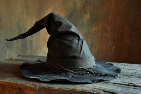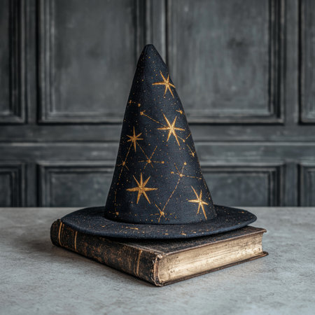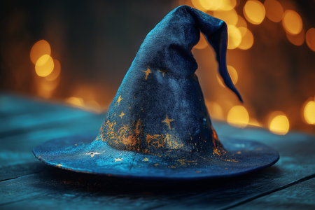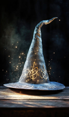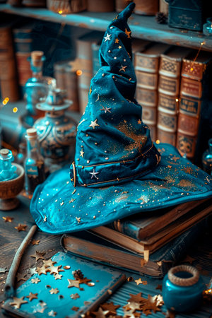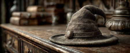 A vintage wizard hat elegantly displayed on an antique wooden table beside old books