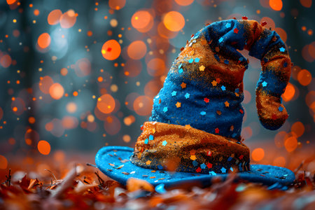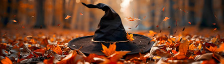 Witch s hat resting on a pile of vibrant autumn leaves creating a mystical and mysterious Halloween atmosphere in the forest The scene evokes a sense of enchantment and the supernatural