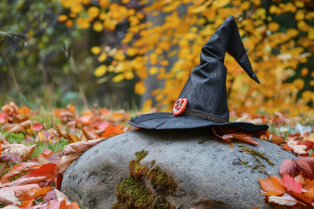 A black witch hat adorned with a red button rests on a rock, surrounded by colorful autumn leaves in a tranquil outdoor setting.