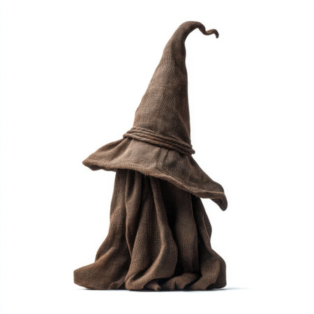This rustic brown fabric witch hat features a draped cloth design, perfect for Halloween costumes, decorations, theater props, and adding a touch of whimsy to any event.