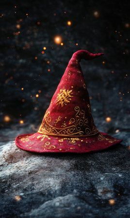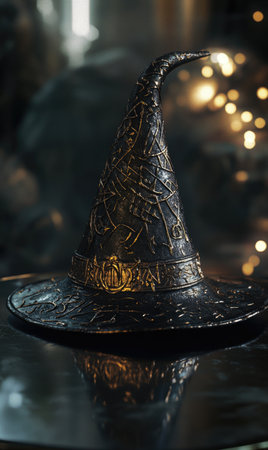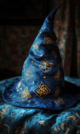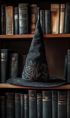A midnight black wizard hat, embroidered with runes, placed on a bookshelf