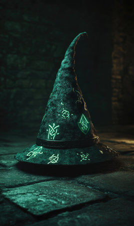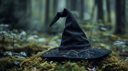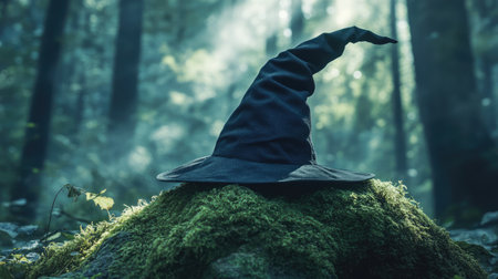 Witch hat on a moss-covered rock in a misty forest with magical lighting