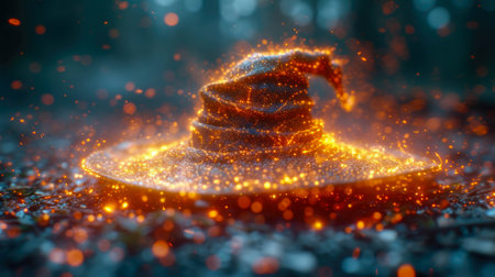 A magician hat emitting glowing sparks, set against a starry night background with a mystical, surreal ambiance.