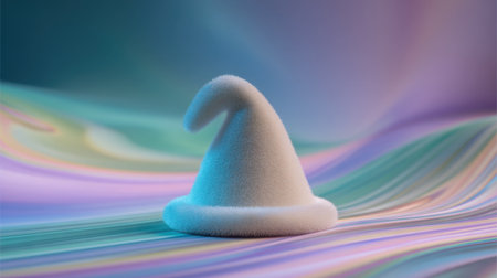 A whimsical white foam hat sits atop a colorful abstract background, featuring smooth waves and soft textures, ideal for creative and playful design projects.