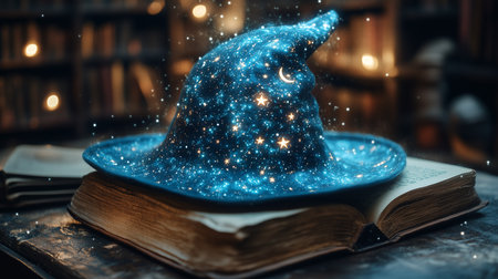 a blue wizard hat with stars and a moon remains on an open old book in a library, radiating magic light