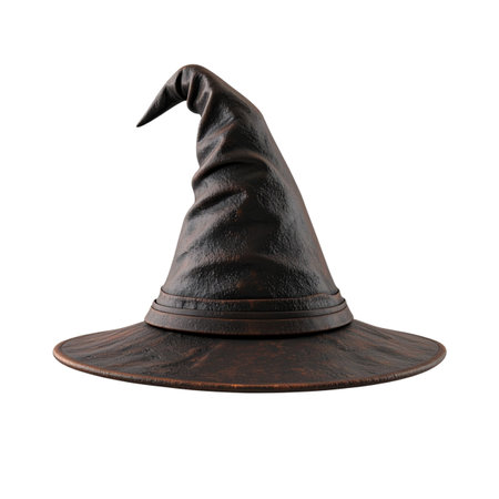 Dark wizard pointed hat with curved tip and gold stars decorations, isolated on white background, perfect for Halloween and fantasy projects