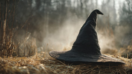 An enigmatic pointed hat, cloaked in shadows, lies atop brittle grass amidst a misty woodland as dawn's subtle glow casts an otherworldly, enchanting aura.